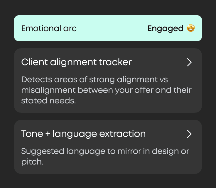 Instantly turn a session into polished proposals, strategy briefs, or slide decks—90 % done the moment the call ends.