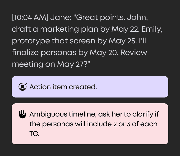 Live nudges flag drift, surface unanswered questions, and keep your agenda laser-focused.