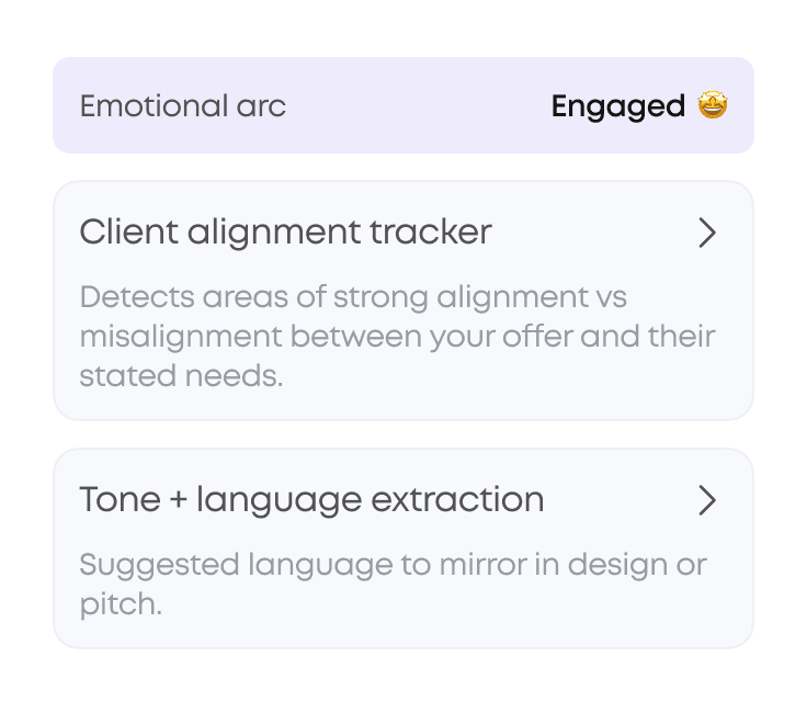 Instantly turn a session into polished proposals, strategy briefs, or slide decks—90 % done the moment the call ends.