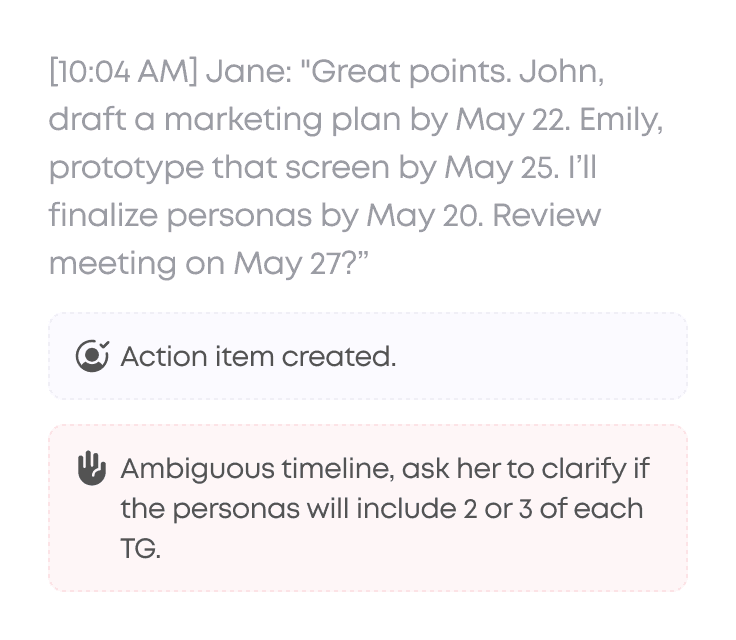 Live nudges flag drift, surface unanswered questions, and keep your agenda laser-focused.